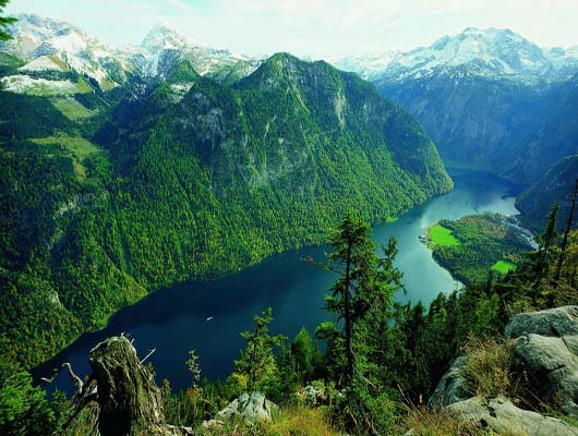 Der einzige alpine Nationalpark Deutschlands liegt im Berchtesgadener Land. Hier stehen Schutz der gesamten Natur, Forschung, Umweltbildung und Erholung im Mittelpunkt. Geprägt ist die Landschaft von tief eingeschnittenen Tälern, wie am Königssee und großen Gebirgsstöcken um den Watzmann. |